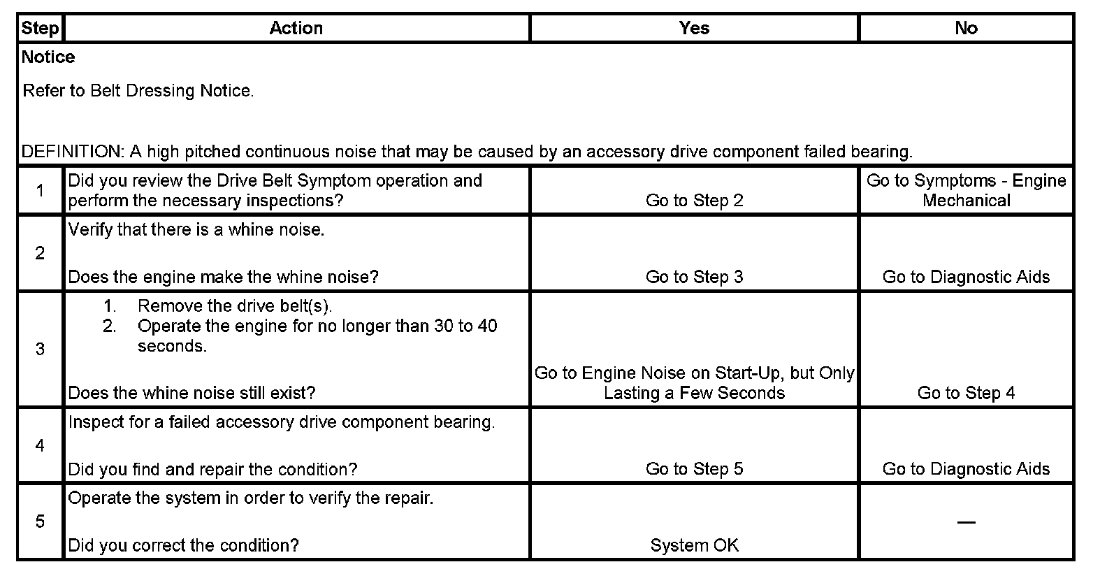3. This test is to verify that the noise is being caused by the drive belt(s) or the accessory drive components. When removing the drive belt the water pump may not be operating and the engine may overheat. Also DTC's may set when the engine is operating with the drive belt removed.