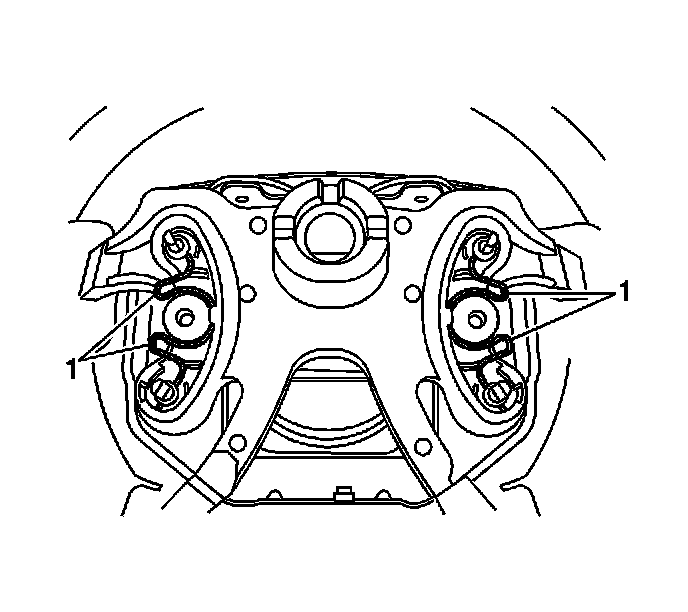 5. Push the inflatable restraint module into the steering wheel to engage and latch the leaf spring fasteners (1).