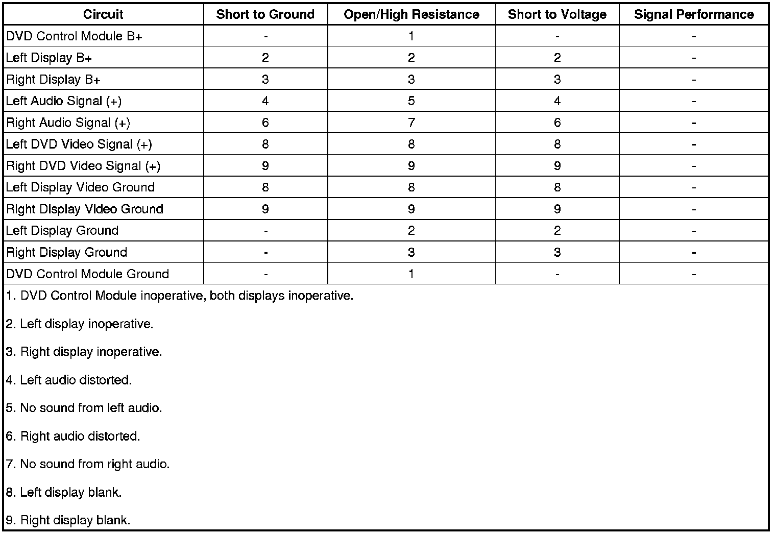 • If less than specified range, test the signal circuit for a short to ground or open/high resistance. If the circuit tests normal, replace the DVD control module.