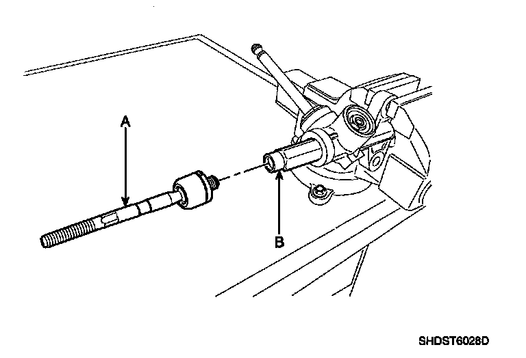 4. Remove the tie rod (B) from the rack bar (A) by unscrewing the tie rod inner ball joint.