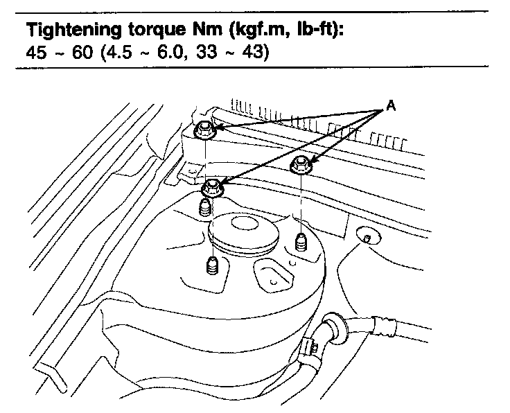 1. Install the front strut assembly to the wheel housing panel by tightening the mounting nuts (A).