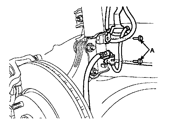 4. Install the brake hose and wheel speed sensor bracket to front strut assembly by tightening the mounting bolts (A).