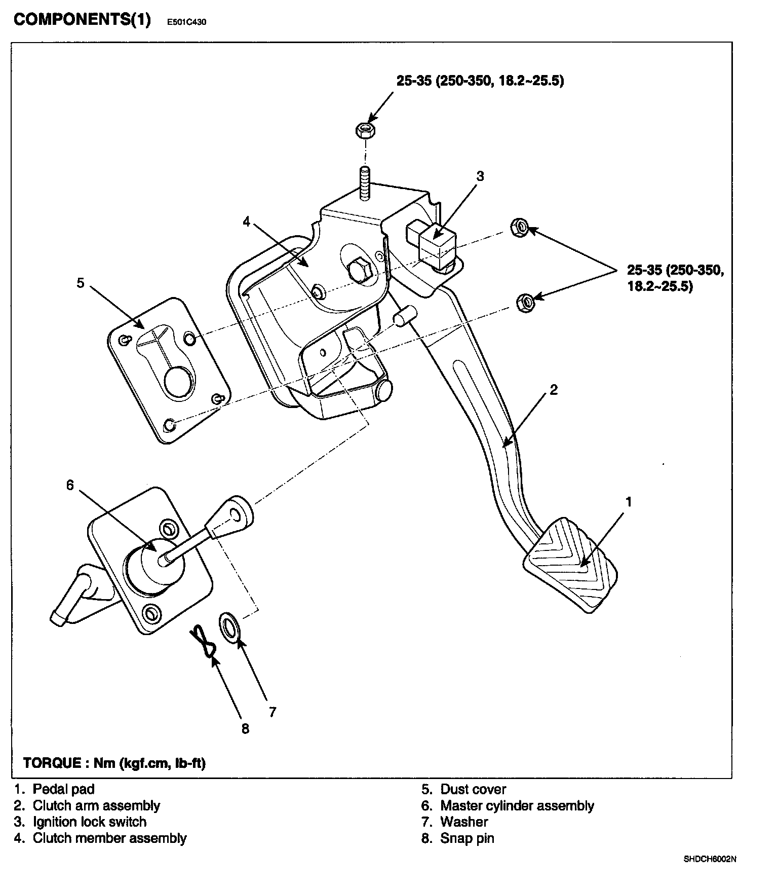7. Remove the screws or nut mounting the master cylinder to the clutch pedal assembly.