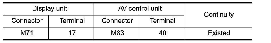 3. Check continuity between display unit harness connector and AV control unit harness connector.