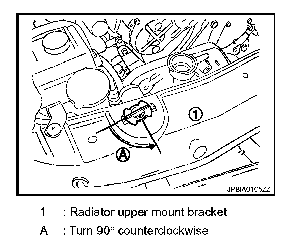 7. Rotate two radiator upper mount brackets 90 degrees in direction as shown in the figure, and remove them.