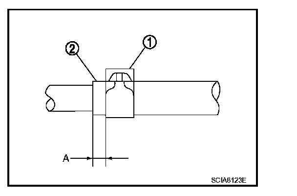 - Set hose clamps (1) at the both ends of A/T fluid cooler hoses (2) with dimension (A) from the hose edge.