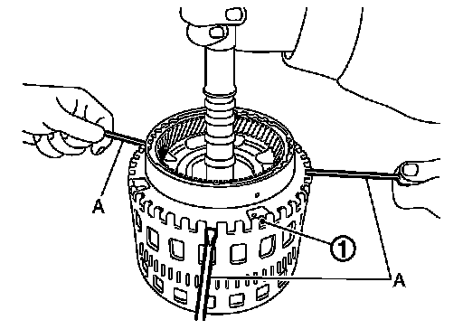 2. Compress snap ring (1) using flat-bladed screwdrivers (A).