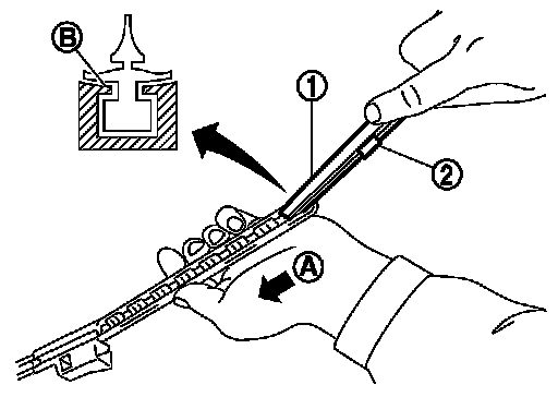 - Insert the wiper refill to be held securely by tab (B) of wiper blade.