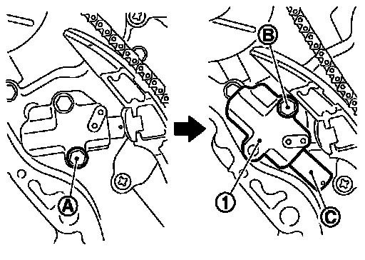 b. Loosen upper mounting bolt (B) slowly, and then turn chain tensioner (primary) on the upper mounting bolt so that plunger (C) is fully expanded.