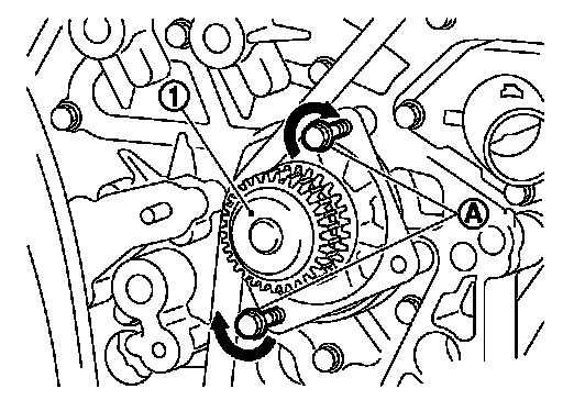b. Screw M8 bolts (A) [pitch: 1.25 mm (0.049 in) length: approx. 50 mm (1.97 in)] into water pumps upper and lower mounting bolt holes until they reach timing chain case. Then, alternately tighten each bolt for a half turn, and pull out water pump (1).