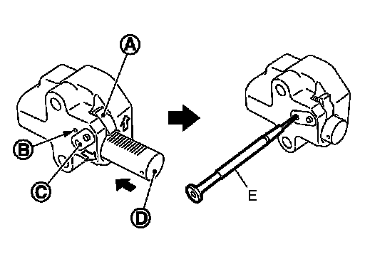 e. To secure lever, insert stopper pin (E) through hole of lever into tensioner body hole (B).