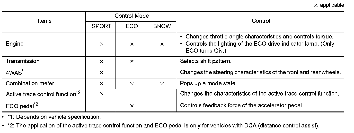 - The vehicle characteristics are controlled from the STANDARD mode (" " position of the drive mode select switch) to any mode listed below: