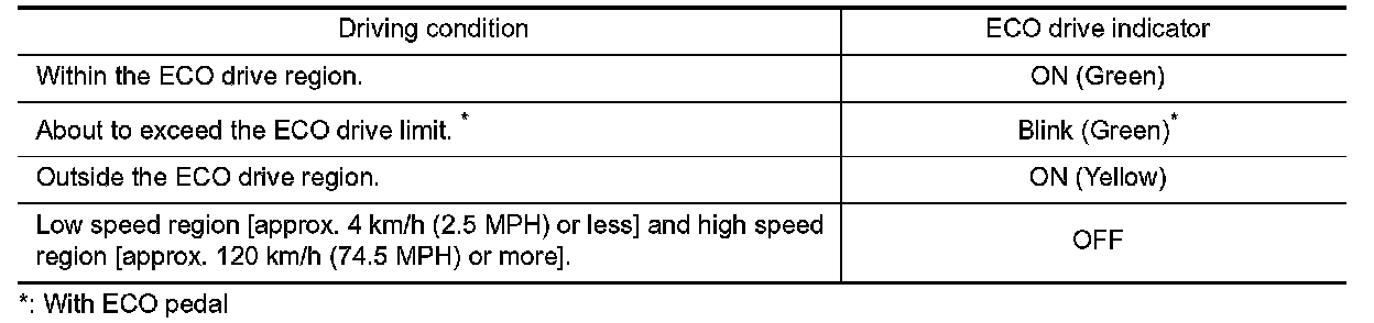 - The ECO drive indicator lamp changes depending on the state of the fuel-efficient region, fuel-efficient limit region, or fuel-efficient region excess.