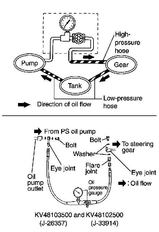 and the oil pressure gauge adapter [SST: KV48102500 (J-33914)] between oil pump discharge connector and high-pressure hose. Bleed air from the hydraulic circuit while opening valve fully. Service and Repair.