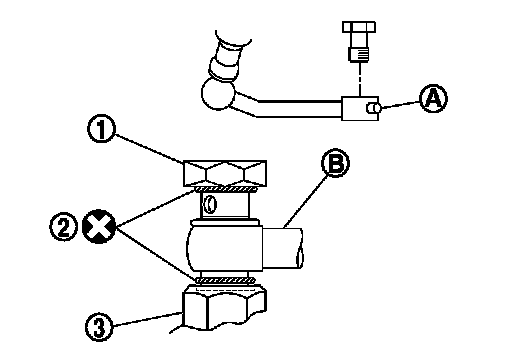 - Install eye bolt with eye joint (assembled to high pressure hose) (B) protrusion (A) facing with pump side cutout, and then tighten it to the specified torque after tightening by hand. (2WD), ST81, "AWD : Exploded View" (AWD).
