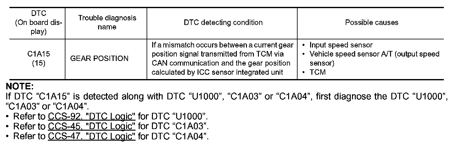 If DTC "C1A15" is detected along with DTC "U1000", "C1A03" or "C1A04", first diagnose the DTC "U1000", "C1A03" or "C1A04".