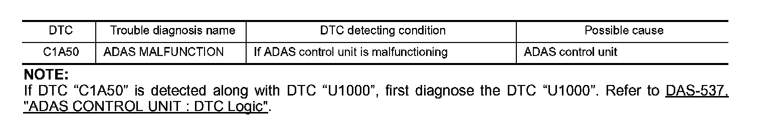 If DTC "C1A50" is detected along with DTC "U1000", first diagnose the DTC "U1000". BSW & BSI.