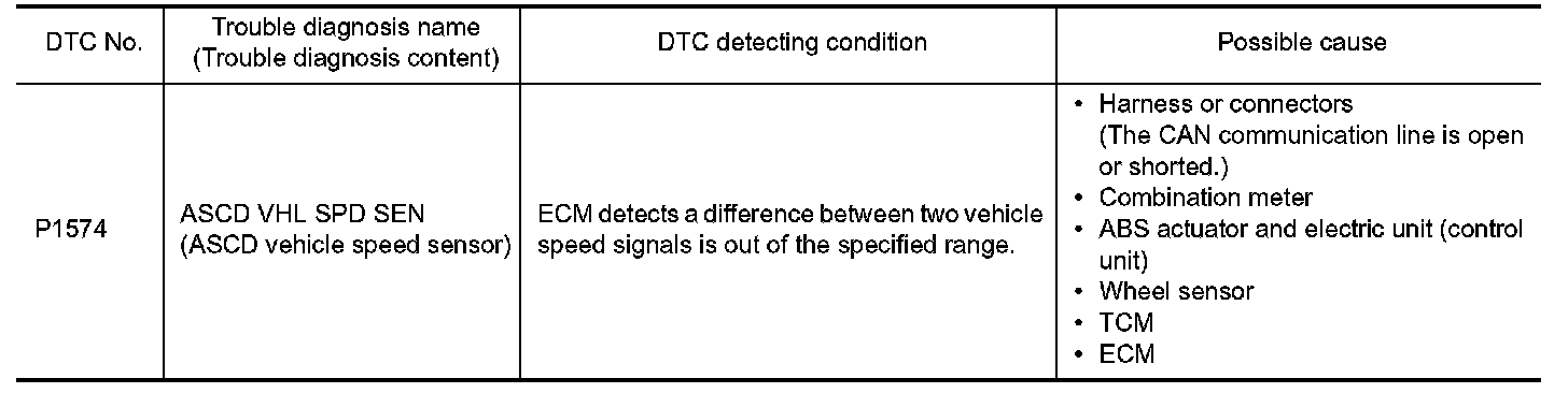 The ECM receives two vehicle speed signals by the CAN communication line. One is sent from "combination meter", and the other is from TCM (Transmission control module). The ECM uses these signals for ASCD control. System Description for ASCD
