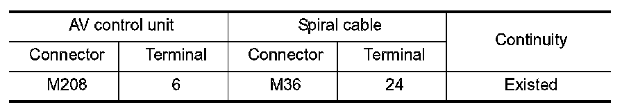 2.Check continuity between AV control unit harness connector and spiral cable harness connector.