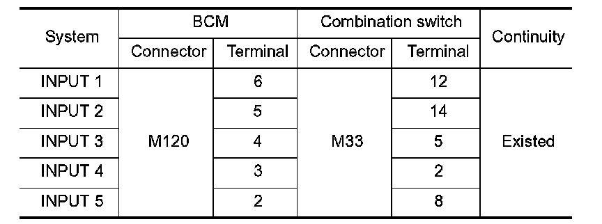 3.Check continuity between BCM harness connector and combination switch harness connector.