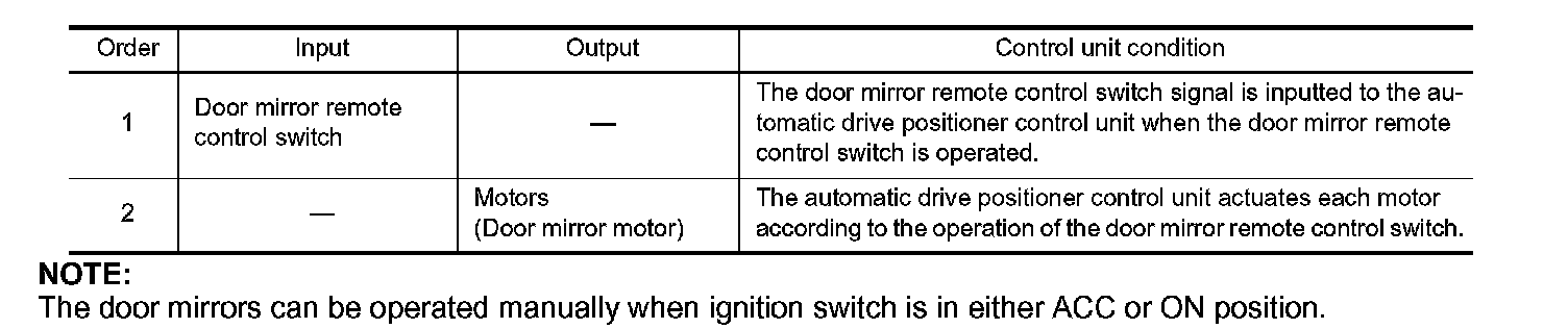 The door mirrors can be operated manually when ignition switch is in either ACC or ON position.
