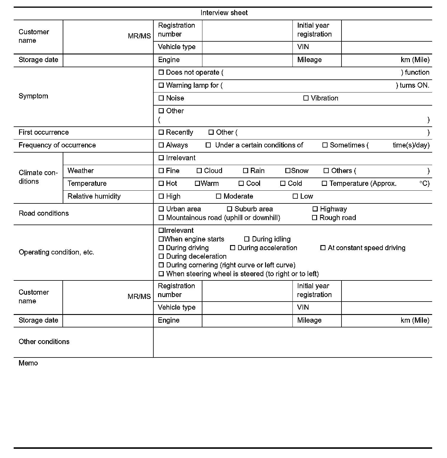 - In general, customers have their own criteria for a problem. Therefore, it is important to understand the symptom and status well enough by asking the customer about his/her concerns carefully. To systemize all the information for the diagnosis, prepare the interview sheet referring to the interview points.