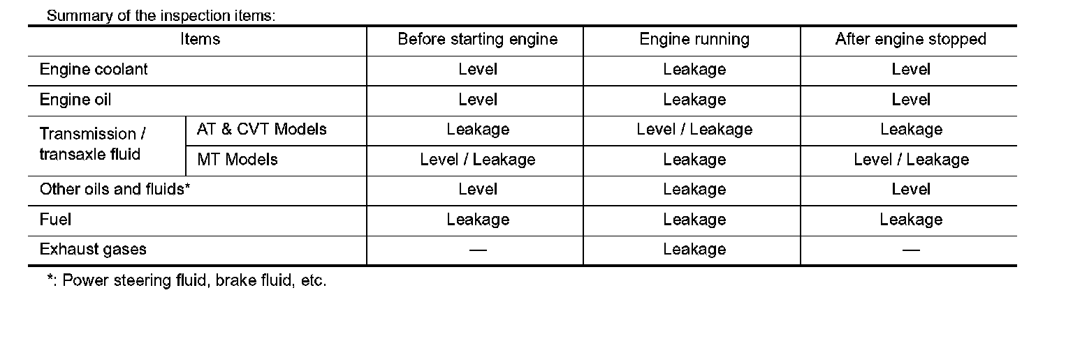 - Warm up engine thoroughly to check that there is no leakage of fuel, or any oil/fluids including engine oil and engine coolant.