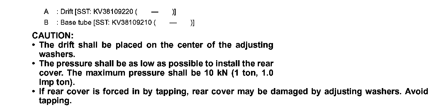 - If rear cover is forced in by tapping, rear cover may be damaged by adjusting washers. Avoid tapping.
