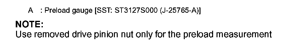 g.Tighten to drive pinion lock nut using flange wrench (commercial service tool), while adjusting pinion bearing preload torque using preload gauge [SST: ST-3127S000 (J-25765-A)].