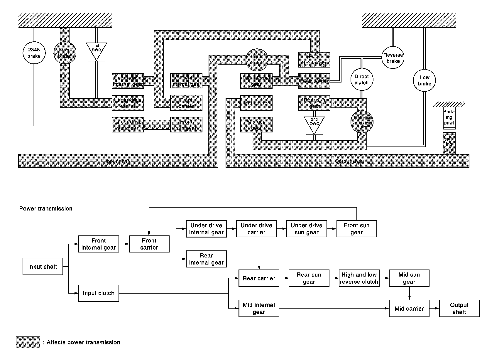 - The 1st one-way clutch and the front brake regulate counterclockwise rotation of the under drive carrier.