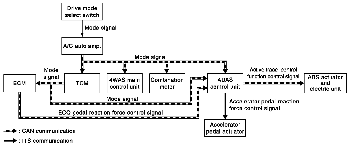 - The ADAS control unit receives a mode signal from the A/C auto amp. and changes the characteristics of the active trace control function via CAN communications with the ABS actuator and electric unit.