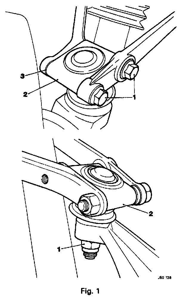 ^ Undo and remove upper ball joint securing nut (3 Fig. 1), fit service tool JD 100 and break the taper.