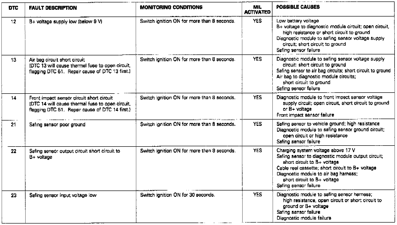 DTC Codes 12, 13, 14, 21, 22, 23: