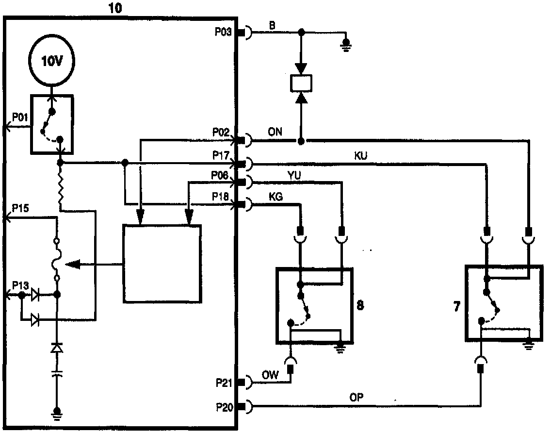 The Air Bag Diagnostic Module (DM) monitors voltage level at pins 2 and 6. If this voltage falls to 5 volts, or less, the MIL Lamp will illuminate and fault code 14 will be present, indicating a short-circuit ground on either off the two front impact sensor circuits. During the presence of fault code 14 the DM internal thermal fuse will blow, disabling the airbag deployment circuit. If voltage to pins 2 and 6 is restored after the fuse has blown, fault code 51, open internal fuse will be present. Fault code 14 will be present only as long as the short to ground remains.