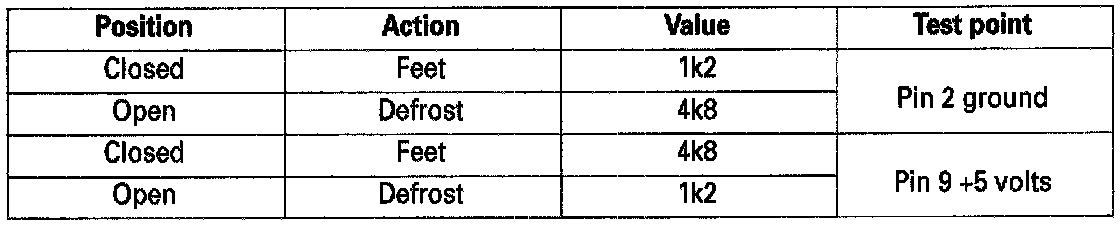 Check resistance between potentiometer connector pins 9 and 2 at air distribution box connector (black 12-way), value should be 6 K Ohms ± 10% at 20 °C.