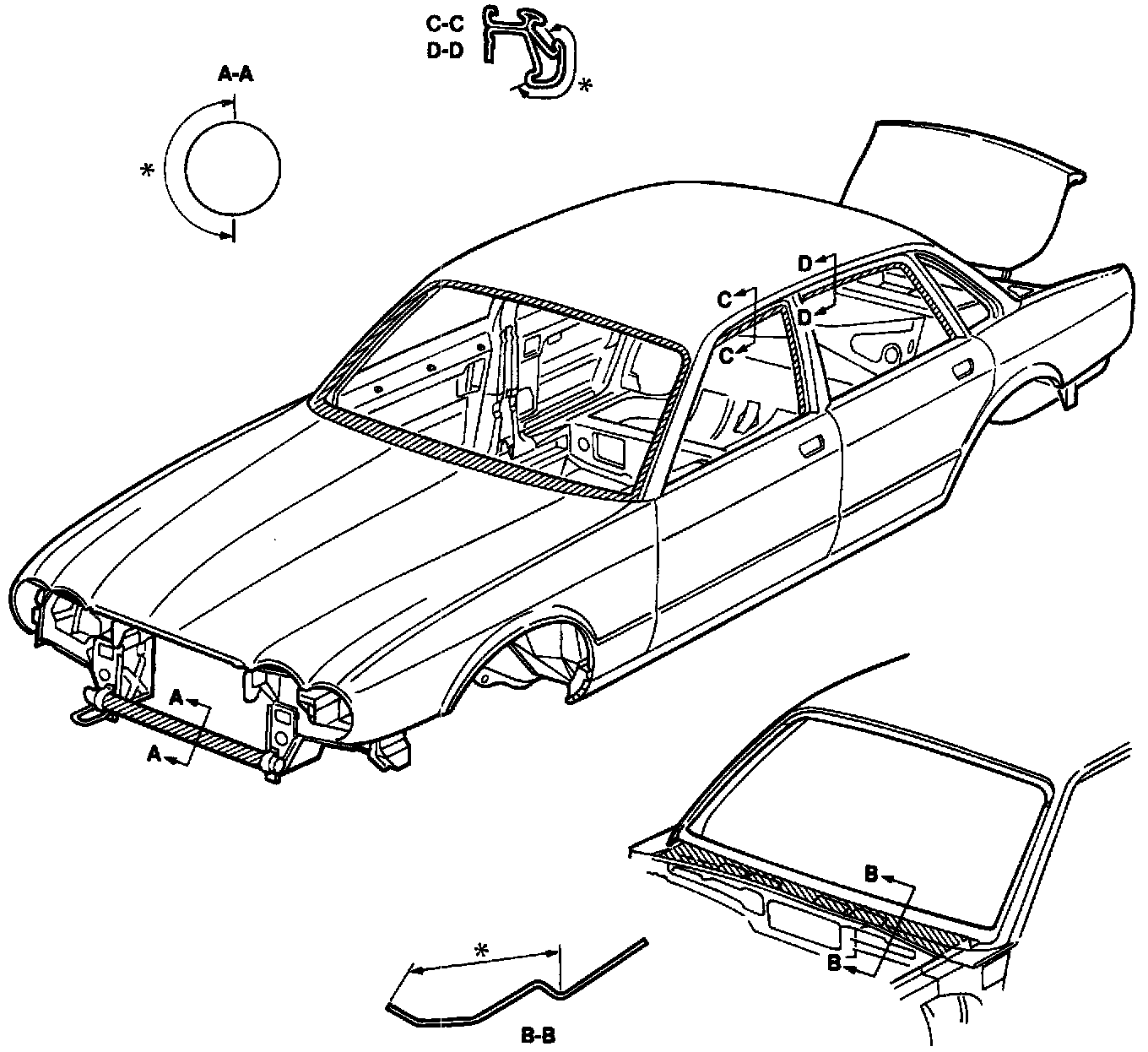 To avoid visibly of unsightly areas between panels and through gaps, the application of matt black paint is required in certain areas. It should be noted that this process is NOT required on dark colored vehicles. The paint, which should have a heat resistance of 40°to 120°C should be applied in accordance with Image to the areas marked with an asterisk (*).