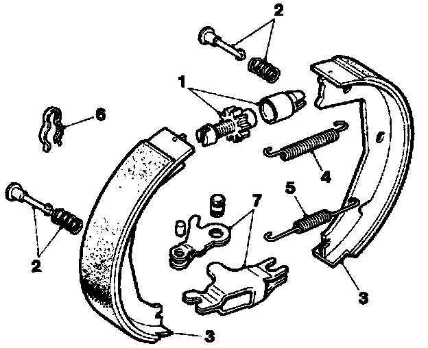 6. Ease the two shoes (3) complete with adjuster assembly away from the back plate.