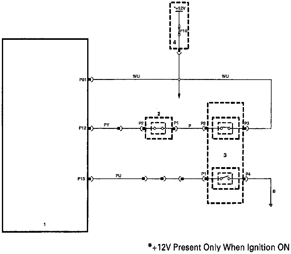 a. Unplug switch pack connector and check for battery voltage between pin 4 and ground with ignition off. If battery voltage is not present, switch ignition off and examine wiring harness, checking continuity between pin 4 and splice FCS16.
