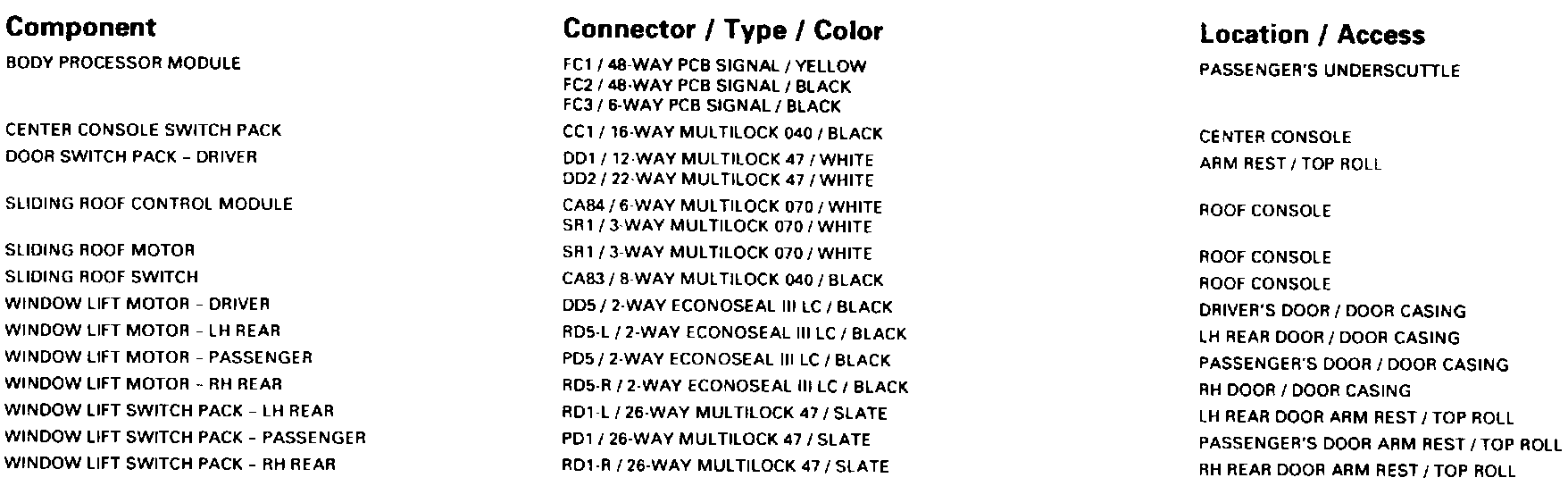Window Lifts; Sliding Roof-LHD: Control Module Pin Out Information: