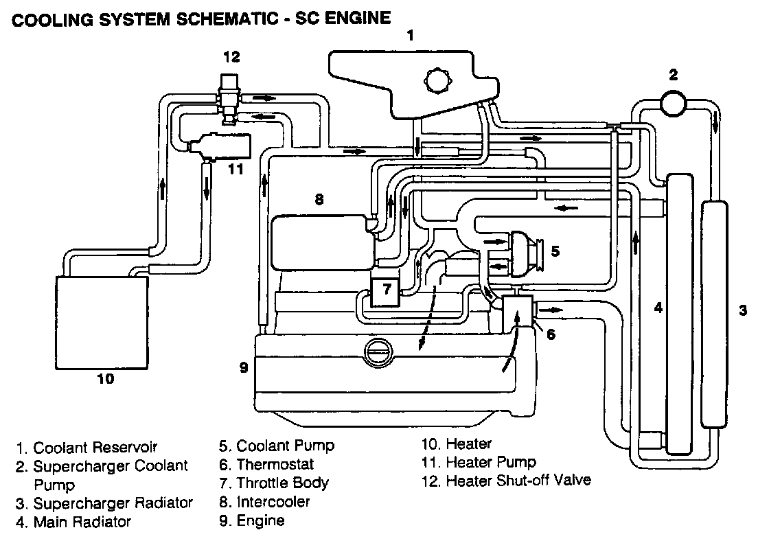 Changes to the cooling system consist of a new radiator, coolant reservoir, engine-driven coolant pump and radiator bottom hose. In addition, a new shut-off valve and an electric pump are introduced to the heater circuit. On vehicles with the SC engine, a new coolant circuit is introduced for the supercharger intercooler. The intercooler circuit contains a radiator and an electric pump, together with the necessary connecting hoses.