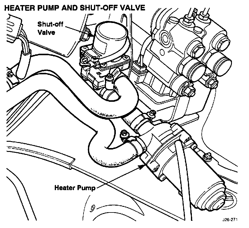 The electric heater pump is installed on the toeboard, adjacent to the heater shut-off valve, in the supply line to the heater. Operation of the pump is also controlled by the climate or heater control modules.