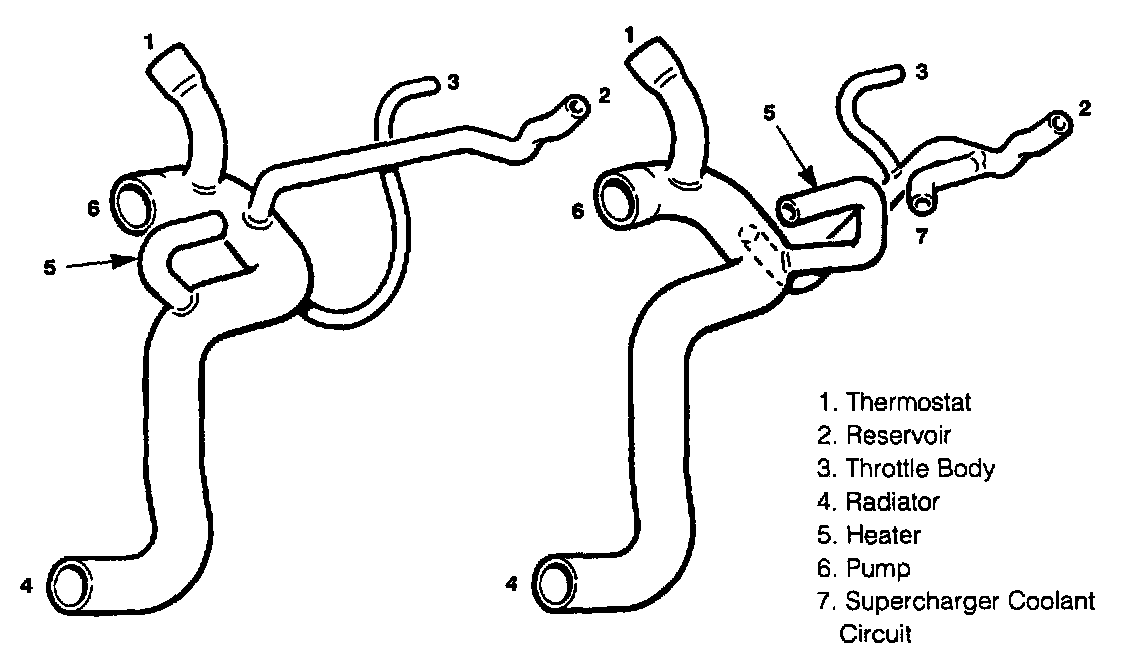 The configuration of the cooling system for normally aspirated and supercharged (4.0 liter) engines is shown in System Configuration.