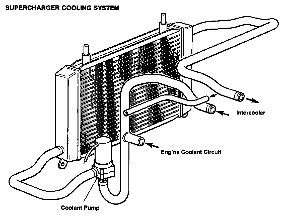 The supercharger coolant pump is an electric pump used to ensure an adequate flow of coolant through the intercooler. It is attached to the left end of the cross tube, adjacent to the air cleaner, in the return line from the intercooler. The pump runs continuously while the ignition is switched on.