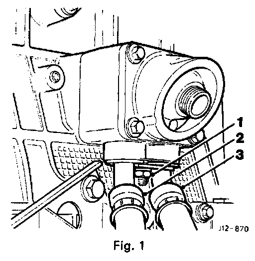 - Remove the nut from the clamp (1 Fig. 1) securing the oil cooler supply hose (2 Fig. 1) and return hose (3 Fig. 1) to the filter head.