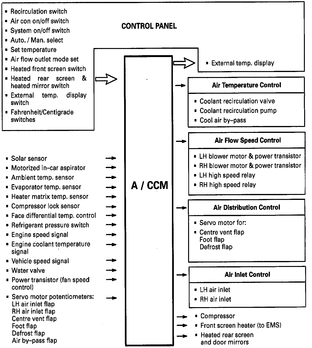 The climate control system peripherals communicate with the A/CCM via three main device categories comprising of manual inputs, automatic outputs and inputs, as shown.