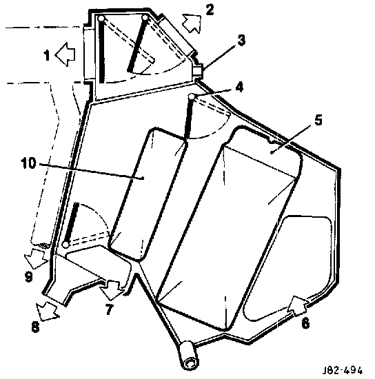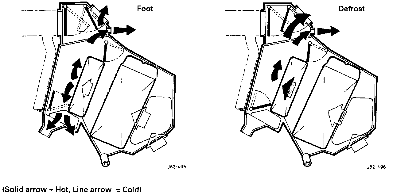 Air is drawn from the plenum chamber into the heater/cooler case at the lower front right and left hand sides. All air must first pass through the evaporator (not fitted to heater only cars) and then through the heater matrix for in-car distribution.