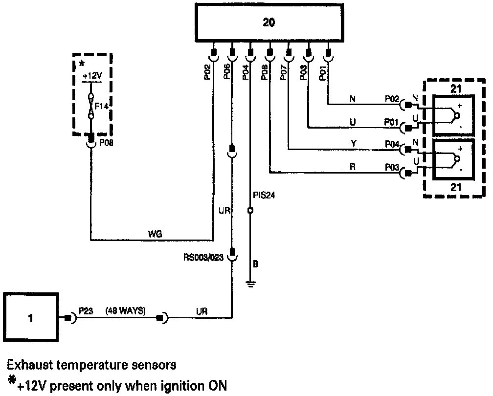 1. Ensure harness wiring is intact from instrument pack pin 23 (48 way connector) to catalyst switching module and from switching module to each thermocouple.