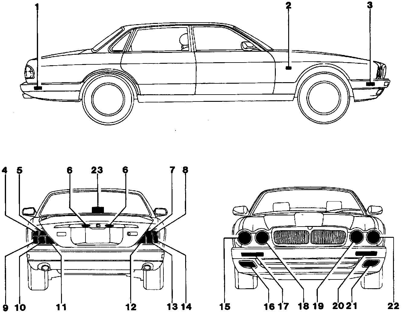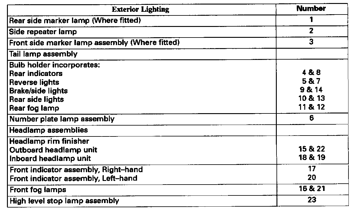 The exterior lamps consisting of two headlamp assemblies containing the inboard and outboard headlamp units incorporating the pilot bulbs, the fog lamps, the front direction indicator lamps and side marker lamps fitted through the front bumper, the repeater lamps positioned on the fenders, the number plate lamps and the rear lights incorporating tail, stop, flasher and fog lamps.