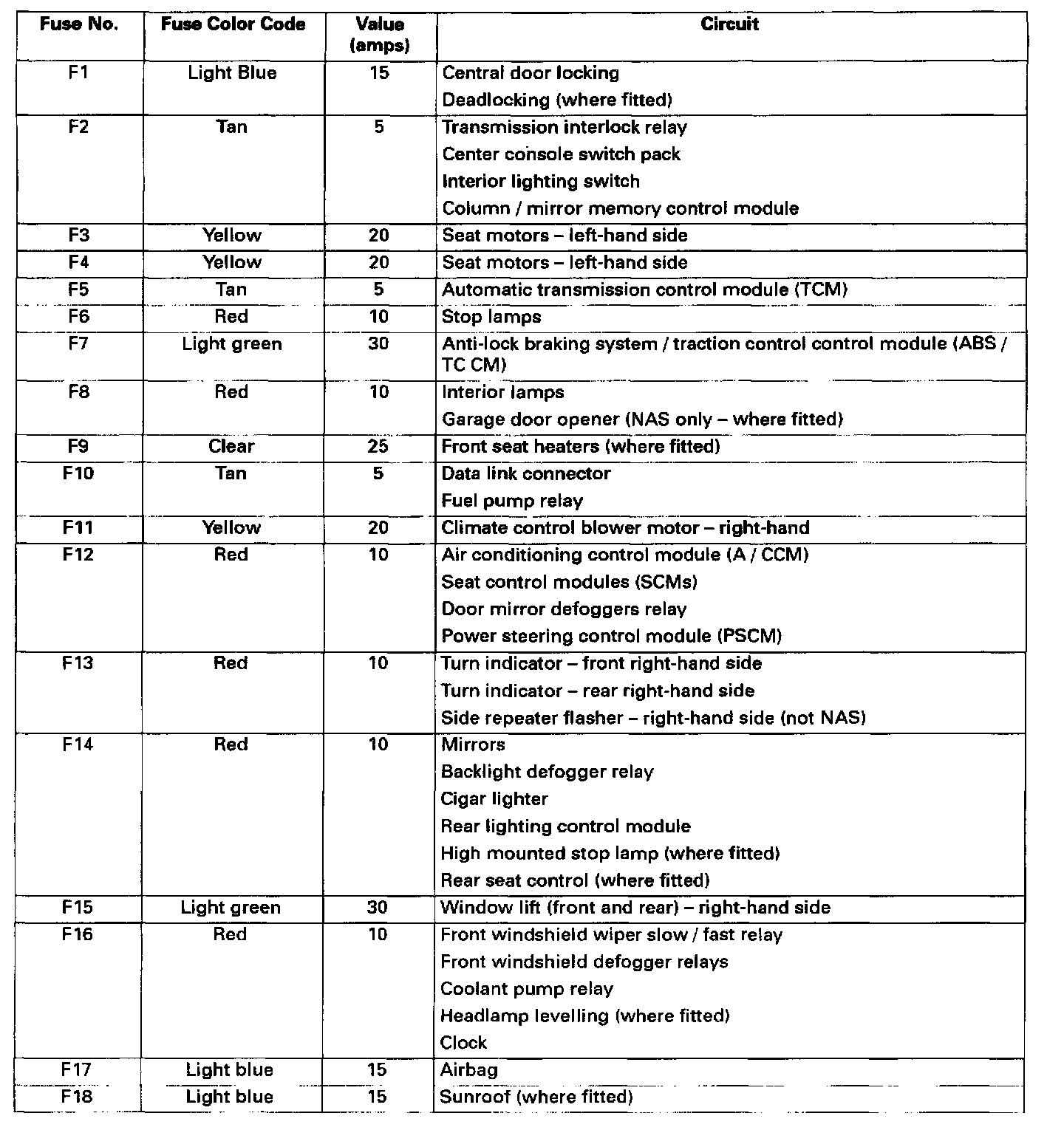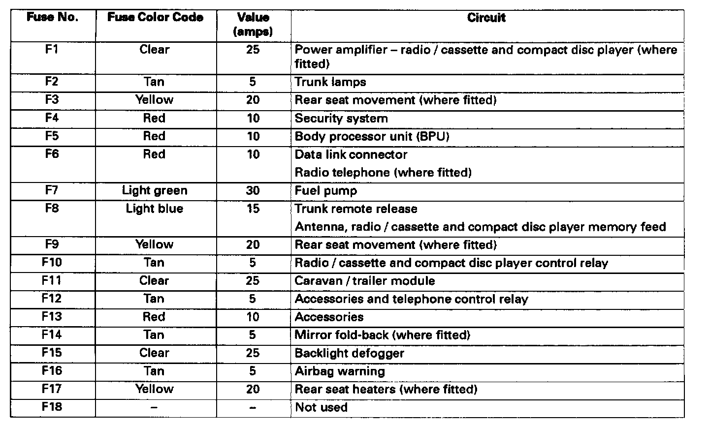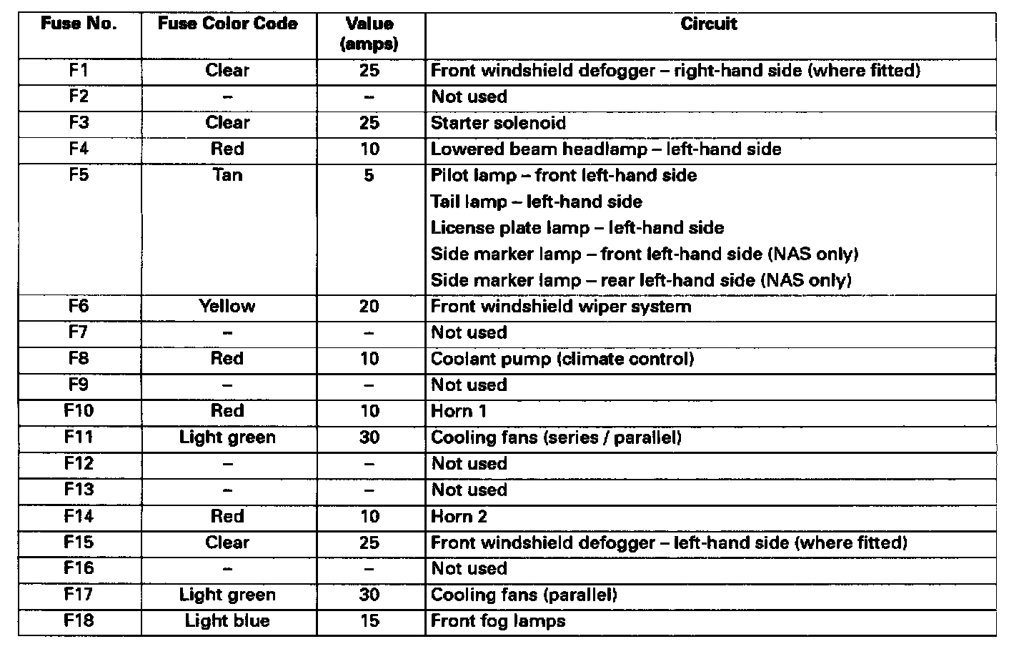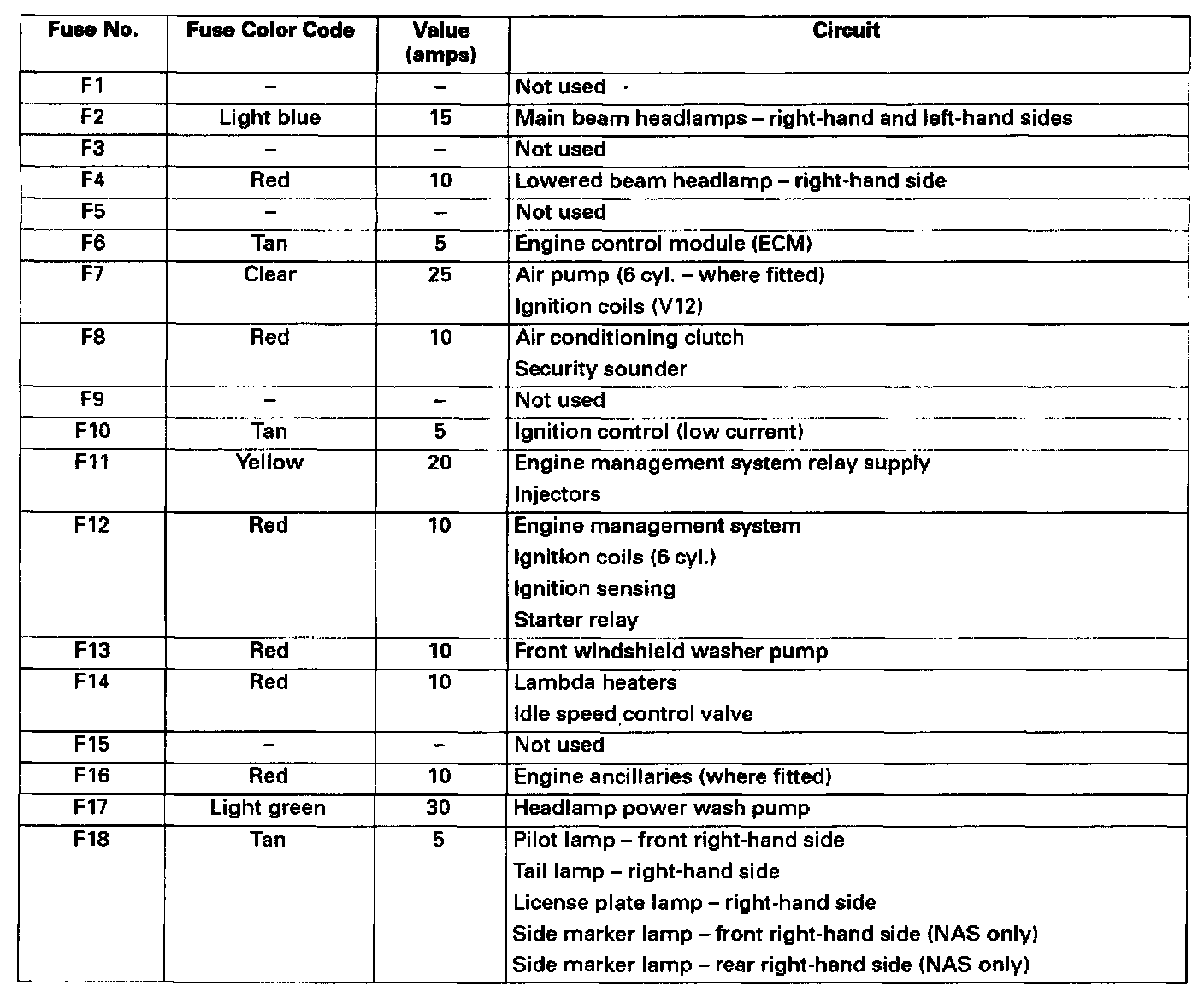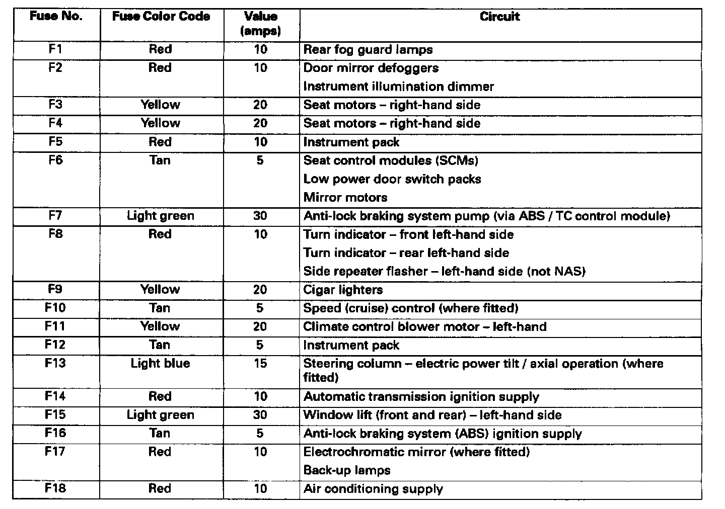 The following tables list all the fuses used in the vehicle; they include fuse box locations, fuse values (amps) and the principal circuits supplied by each fuse.