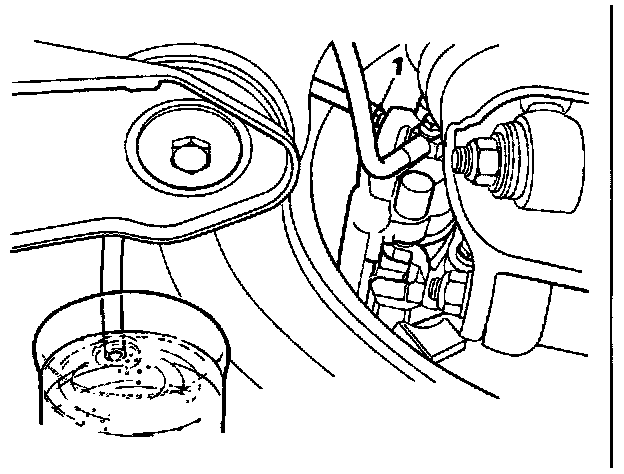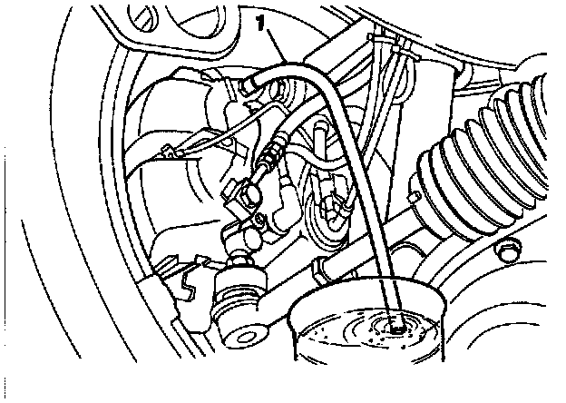 3. Connect the bleeder bottle tube to the right front caliper (see 'note' above) bleeder screw (1) and open the screw.